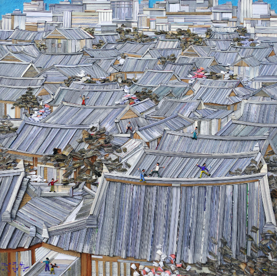 초기에는 주로 책과 물감을 함께 활용한 추상화를 그렸다. 이후 책의 이미지를 더욱 강조하는 방식으로 작업이 변화하며 실제 형상을 담아내는 지금의 방식까지 발전해왔다. 작가는 우리가 살아가는 도시 풍경에 주목한다. <City story> 연작을 통해 서울, 전주 등 다양한 도시의 장면을 담고 있다. 회색 건물 사이로 사람들이 뛰놀고 초록의 나무가 빈틈을 채운다. 작가는 책 속의 여러 이야기가 섞이고 모이는 과정이 한 가족의 이야기가 모여 마을을 이루고, 큰 도시를 이루는 것과 닮아있다고 보았다. 그렇게 ‘도시’라는 소재에 매력을 느끼며 책으로 도시를 짓게 됐다.