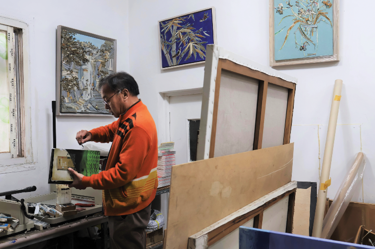 그의 작업은 책을 모으는 일부터 시작된다. 빛바랜 고서부터 소설, 시집, 교과서, 잡지 등 종류를 가리지 않는다. 공통점은 더 이상 읽히지 않는 헌책들이라는 점이다. 재료가 될 책은 다시 펼칠 수 없도록 접착제를 발라 고정한다. 작두와 칼로 책의 단면을 잘라 크고 작은 조각을 만든다. 재질과 색깔, 내용도 모두 다른 책의 단면들은 밑그림 위로 조화롭게 섞이며 하나의 그림이 된다. 오래된 책과 요즘 책, 각자의 사연을 가진 책들이 한 화면에 공존하며 여러 이야기가 이어져 또 하나의 이야기가 된다.