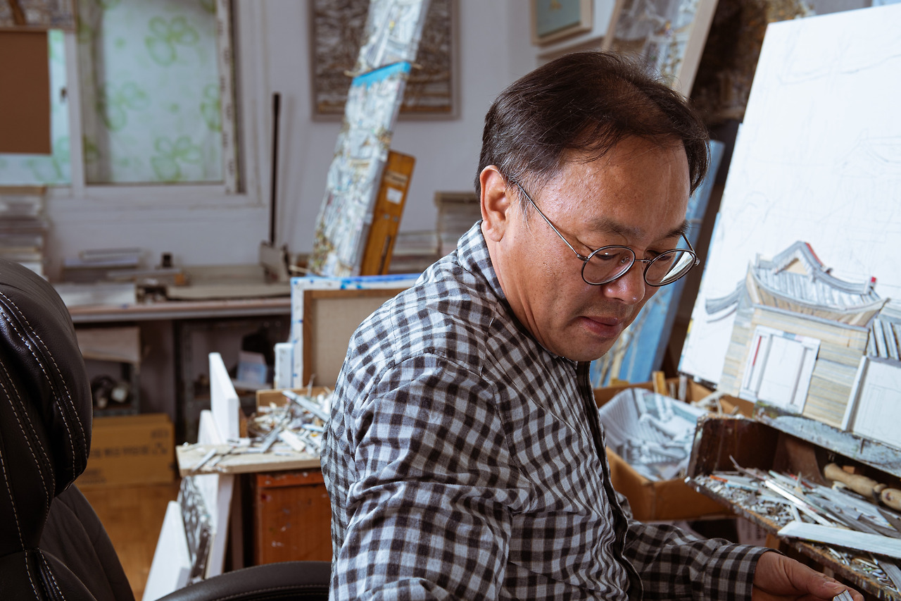 이정웅 작가의 그림을 보고 있으면 유명한 시의 한 구절이 떠오른다. ‘자세히 보아야 예쁘다. 오래 보아야 사랑스럽다’. 작가의 작품에는 직접, 자세히, 오래 들여다봐야만 보이는 비밀이 있기 때문이다. 그는 물감 대신 책을 재료로 그린다. 빽빽한 도시의 빌딩숲, 고즈넉한 한옥 지붕, 곧은 나무까지. 재료의 정체를 알고 나면 그림은 완전히 다르게 보인다. 책이 캔버스 위에서 이만큼 자유로울 수 있다니. 새삼 놀랍다. 화가 이정웅과 책의 인연은 어떻게 시작되었을까. 책을 통해 그리는 그의 세계를 만났다.